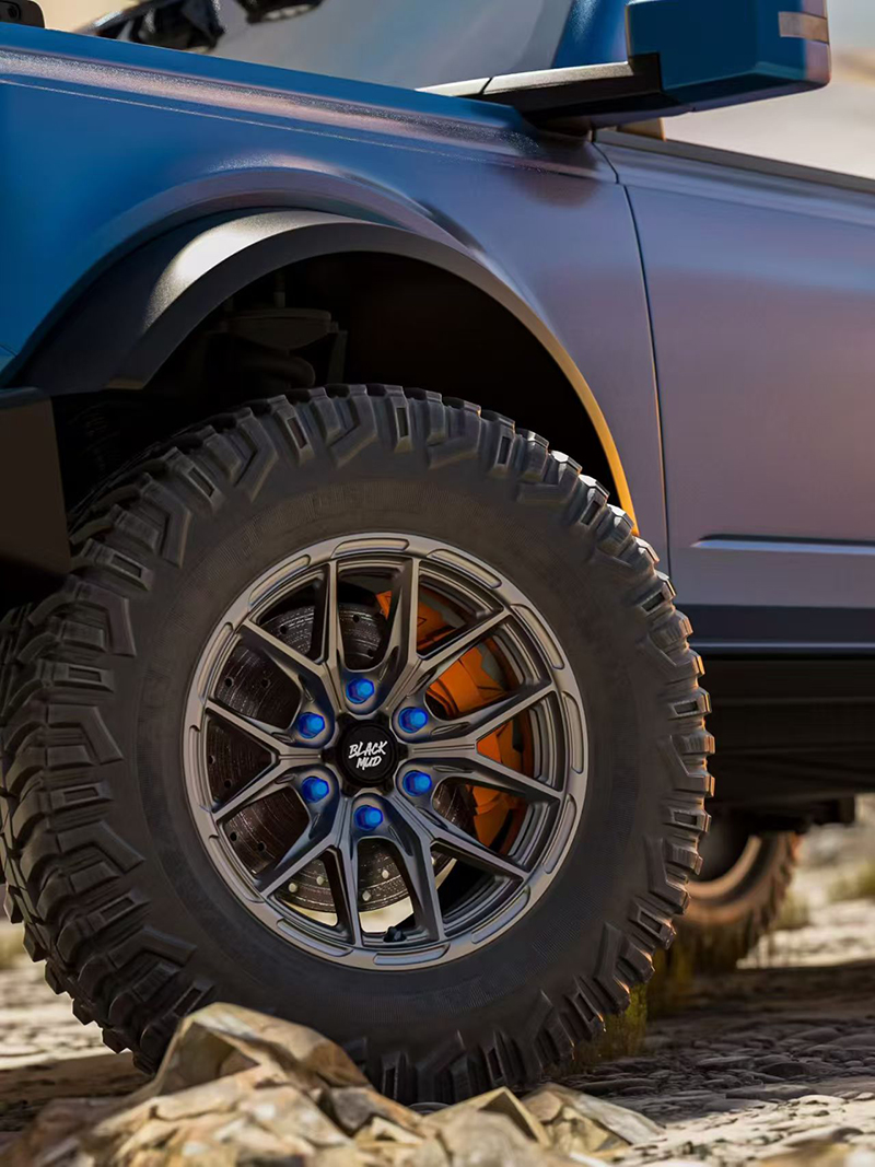 Resistant to sand and mud accumulation, easy to clean. The front and rear rims feature a double inner anti-detachment groove design, preventing detachment during low-pressure driving. Additionally, it is manufactured using a rotary forging process,